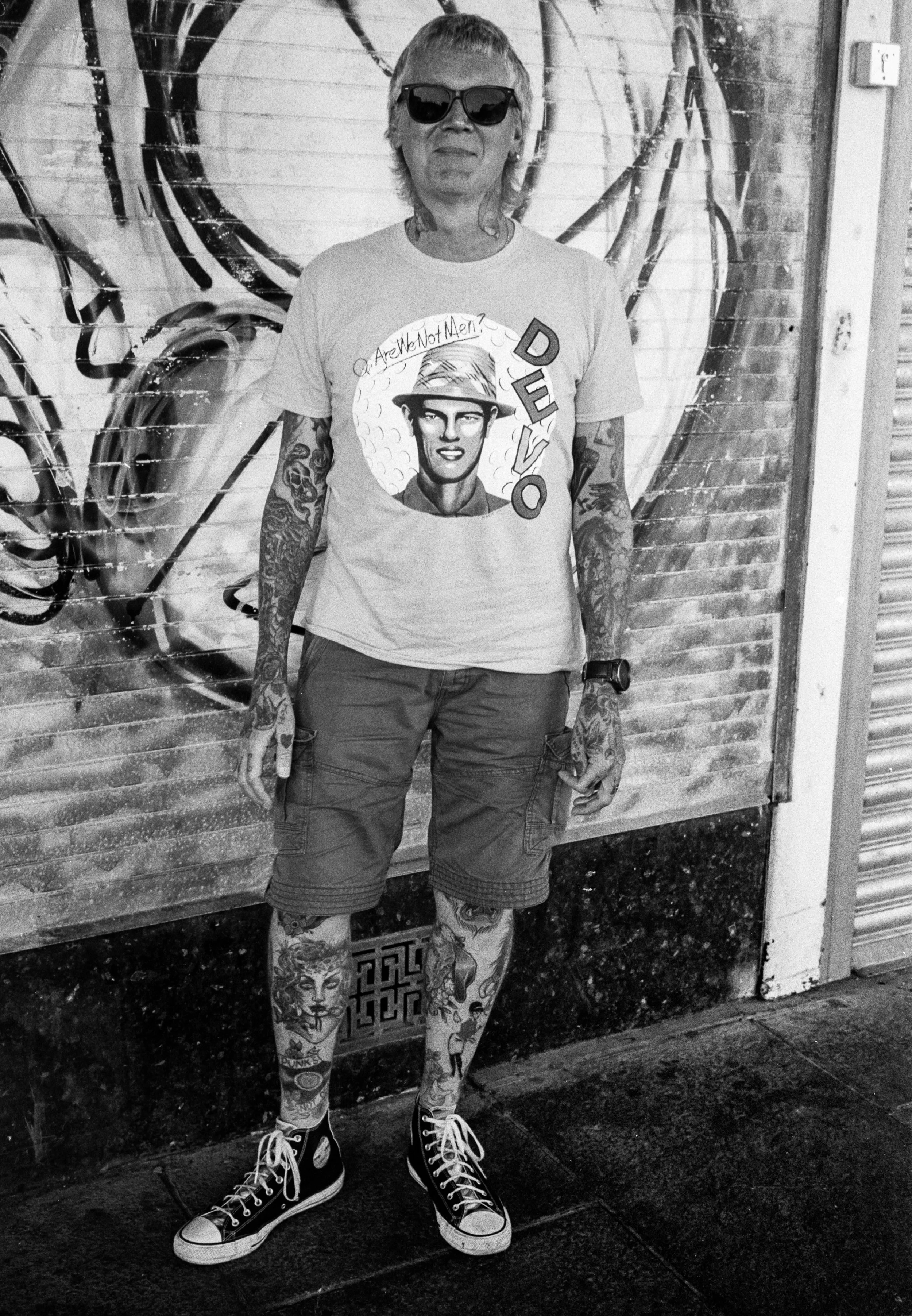 Scroll forward almost forty years and I’m now living in rural South Wales, dividing my work life between the NHS and as a photographer. Having not visited Brighton in almost twenty years, my partner and I decided to take a city break, staying in an Air BnB off Marine Parade, and catching up with one of my old London friends who has long since made the city his home. After a very pleasant meal my partner and I were strolling through The Lanes as the last light was fading, when I spotted a very dapper man in double-breasted cream linen suit, correspondent shoes, a wide brimmed hat at a rakish angle, and standout silver jewellery. I had a 1959 Leica M3 camera slung around my neck, and two frames left on a roll of black and white film. I had to photograph this man, although with the light quickly diminishing, it was touch and go whether any frame would be useable.